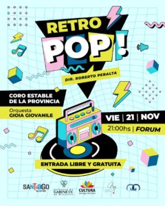 La Subsecretaría de Cultura, el Coro Estable de la provincia y la Orquesta Gioia Giovanile invitaron a toda la comunidad santiagueña a disfrutar, en el marco del Día de la Música, del evento “Retro Pop”, que se desarrollará el viernes 21 a las 21 hs en el Fórum, con entrada libre y gratuita.