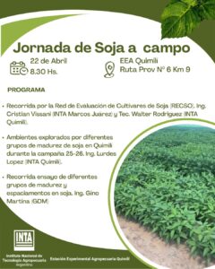 En un contexto agrícola que demanda precisión y actualización constante, el INTA Quimilí abre sus puertas a productores, asesores técnicos y estudiantes para compartir los avances de la actual campaña sojera. La cita tendrá lugar en la sede de la EEA Quimilí, ubicada sobre la Ruta Provincial N° 6 (Km 9), iniciando la acreditación a partir de las 8:30 hs.