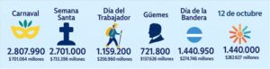 Estos movimientos generaron un impacto económico estimado en $2.366.419 millones, equivalente a unos 1.670 millones de dólares, impulsando la actividad en rubros claves como la hotelería, la gastronomía, el transporte y el comercio local.